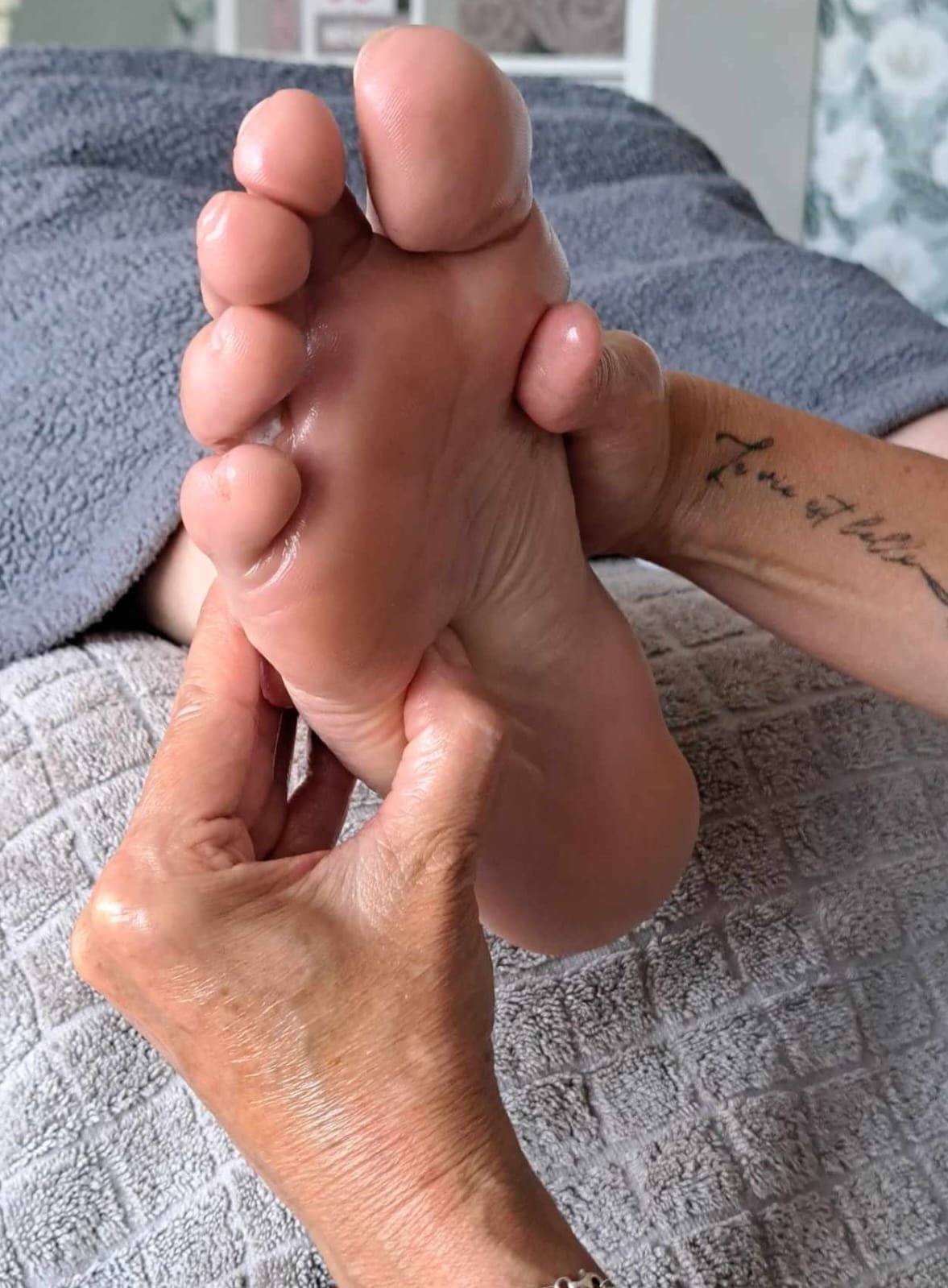 La photo montre une technique de réflexologie plantaire où une pression est appliquée sur une zone spécifique du pied, correspondant au plexus solaire. Cette pratique, couramment utilisée par les réflexologues, vise à stimuler les points réflexes situés au centre de la plante du pied, légèrement en dessous de la base des orteils.